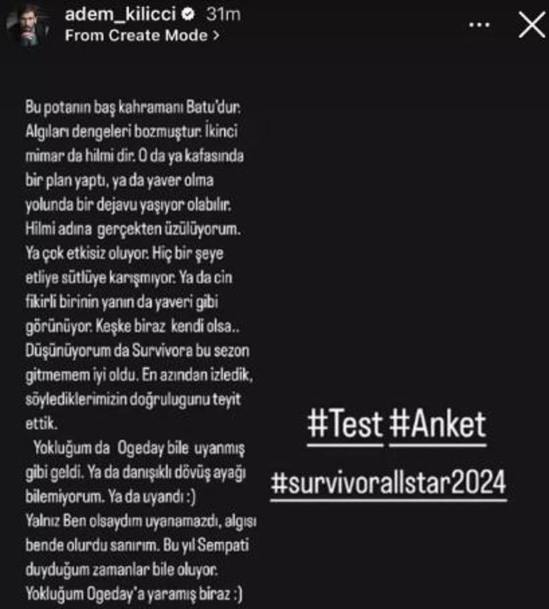 Adem Kılıçcı, kaosun bitmediği Survivor All Star hakkında bu sefer de 'algı' göndermesi yaptı. Başarılı isim, Batuhan için "Algıları, dengeleri bozdu" diyen Adem, Hilmi Cem için "yaver olma peşinde" ifadelerini kullandı.