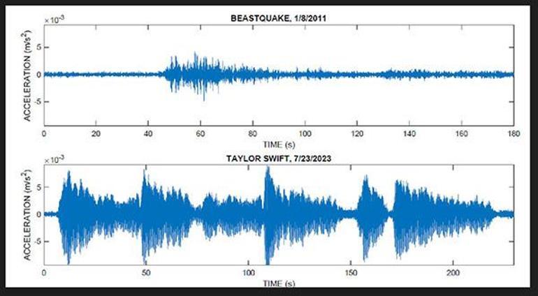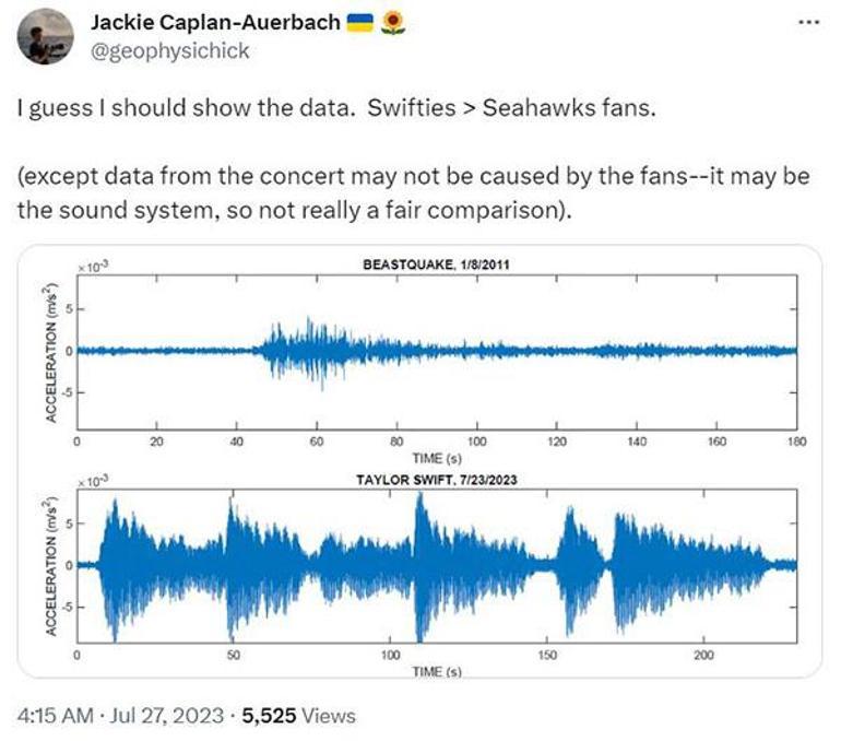 Western Washington Üniversitesi'nde jeoloji ve sismoloji uzmanı olarak görev yapan Prof. Jackie Caplan-Auerbach, 27 Temmuz'da yaptığı basın açıklamasında elde ettiği verilere göre, Taylor Swift’in Seattle’de verdiği konserde dans edenlerin, 2.3 büyüklüğünde depreme eş değer sismik aktiviteye neden olduklarını belirtti.