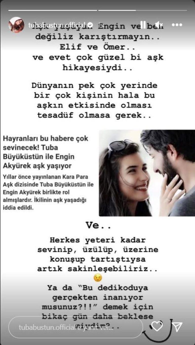 Basına yansıyan aşk haberlerinin ardından ilk açıklama Tuba Büyüküstün'den geldi. Instagram hesabından hakkındaki aşk iddiasını yalanlayan Tuba Büyüküstün şu ifadeleri kullandı:
