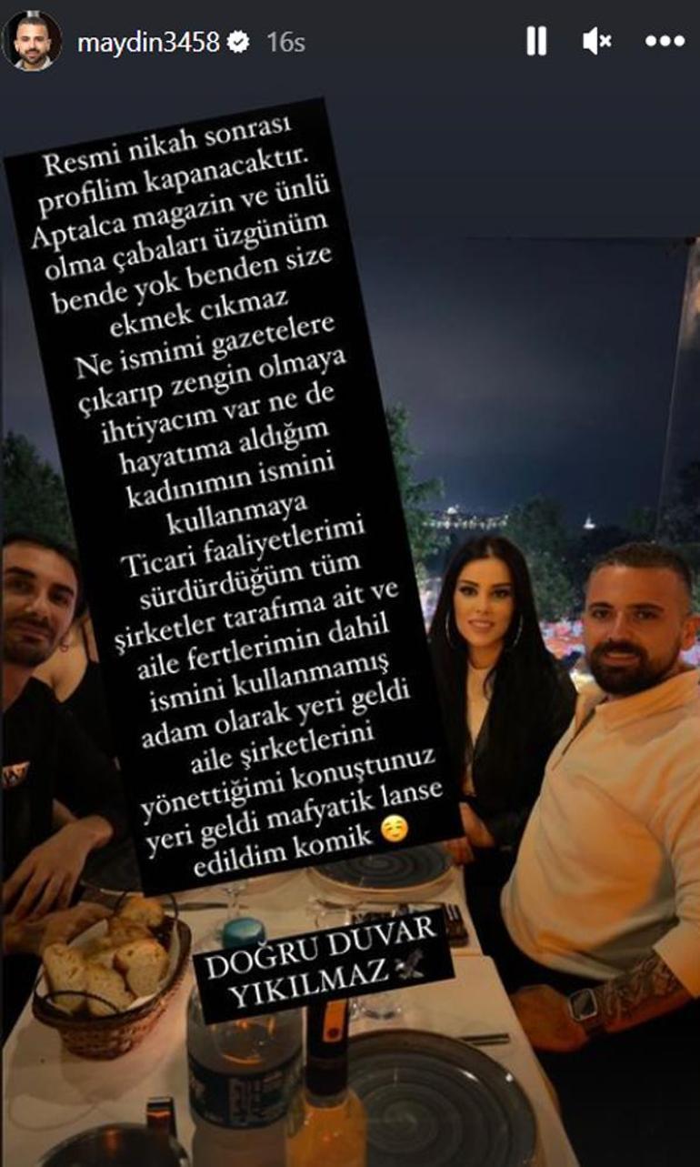 Ayın da kendi sayfasından bir açıklama paylaşarak, "Resmi nikah sonrası profilim kapanacaktır. Aptalca Magazin ve ünlü olma çabaları üzgünüm ben de yok. Benden size ekmek çıkmaz. Ne ismimi gazetelere çıkarıp zengin olmaya ihtiyacım var, ne de hayatıma aldığım kadınımın ismini kullanmaya... Ticari faaliyetlerimi sürdürdüğüm tüm şirketler tarafıma ait ve aile fertlerimin dahil ismini kullanmamış adam olarak yeri geldi aile şirketlerini yönettiğimi konuştunuz, yeri geldi mafyatik lanse edildim. Komik" diye yazdı.