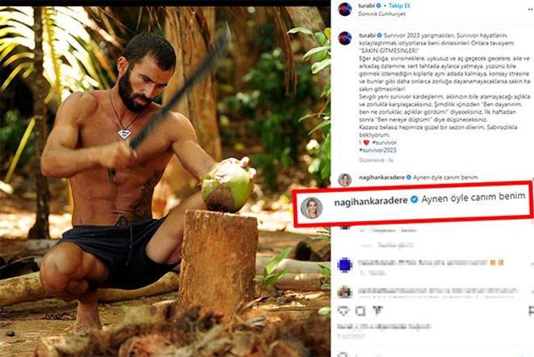 Turabi'nin çok konuşulan gönderisine, Survivor'ın bir diğer eski yarışmacısı Nagihan Karadere'den yorum geldi. Nisa Bölükbaşı'nın şampiyon olarak tamamladığı 'All Star 2022' sezonunda da mücadele eden ve elendikten sonra yaptığı 'haksızlık' açıklamalarıyla adından sıkça söz ettiren Nagihan, "Aynen öyle canım benim" diyerek, eski takım arkadaşına destek verdi.