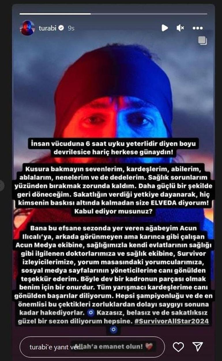 Söz konusu ayrılık büyük yankı uyandırırken, Turabi'den Survivor'a veda ettikten sonra ilk açıklama geldi. Açıklamasında "Sağlık sorunlarım yüzünden bırakmak zorunda kaldım. Daha güçlü bir şekilde geri döneceğim. Sakatlığın verdiği yetkiye dayanarak hiç kimsenin baskısı altında kalmadan size elveda diyorum" ifadelerine yer veren Turabi bu sözlerle sevenlerine de veda etti.