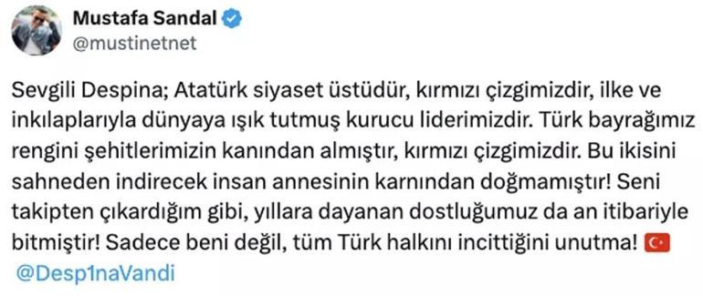 Yunan şarkıcının bu açıklamaları üzerine tepki gösterenlerden biri de ünlü Mustafa Sandal oldu. Türkiye'nin başarılı isimlerinden Sandal, “Sevgili Despina; Atatürk siyaset üstüdür, kırmızı çizgimizdir, ilke ve inkılaplarıyla dünyaya ışık tutmuş kurucu liderimizdir. Türk bayrağımız rengini şehitlerimizin kanından almıştır, kırmızı çizgimizdir. Bu ikisini sahneden indirecek insan annesinin karnından doğmamıştır! Seni takipten çıkardığım gibi, yıllara dayanan dostluğumuz da an itibariyle bitmiştir. Sadece beni değil, tüm Türk halkını incittiğini unutma!” dedi.