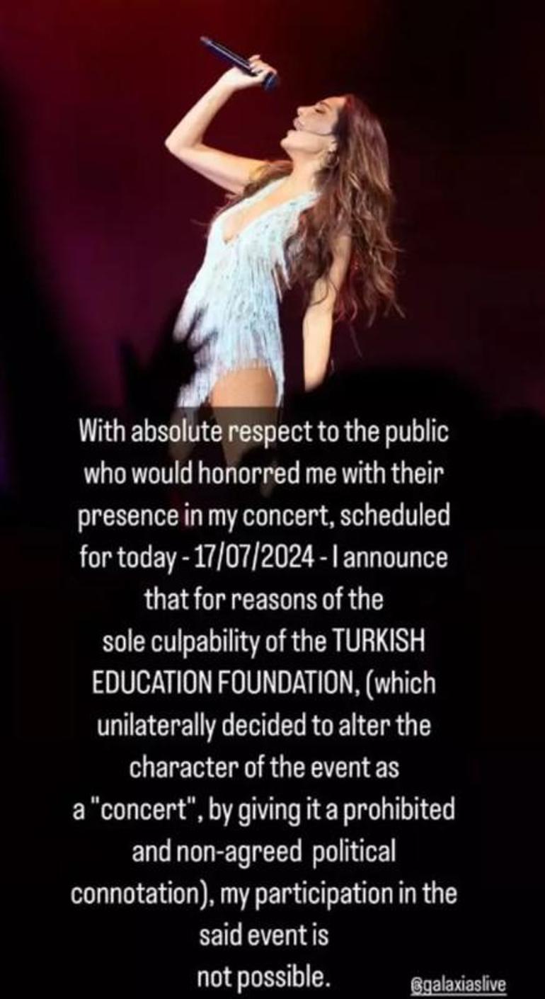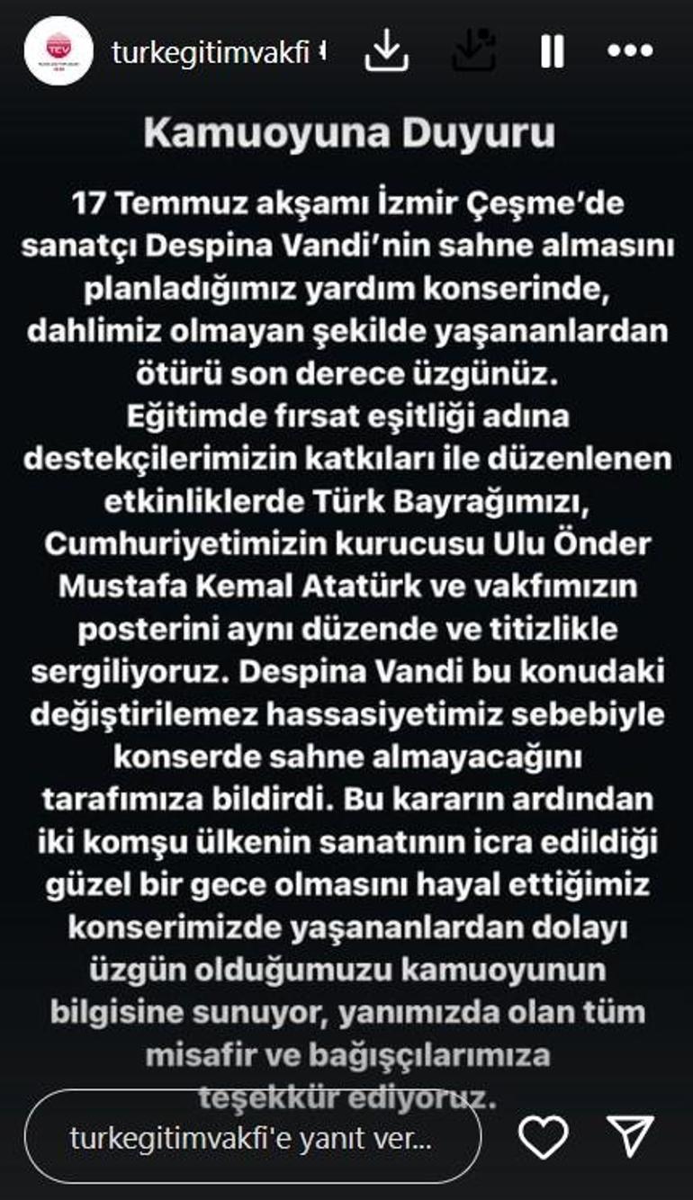 Dernek ise, “Despina Vandi değiştirilemez hassasiyetimiz sebebiyle konserde sahne almayacağını tarafımıza bildirdi. Bu kararın ardından iki komşu ülkenin sanatının icra edildiği güzel bir gece olmasını hayal ettiğimiz konserimizde yaşananlardan dolayı üzgün olduğumuzu kamuoyunun bilgisine sunuyoruz” açıklamasını yaptı.