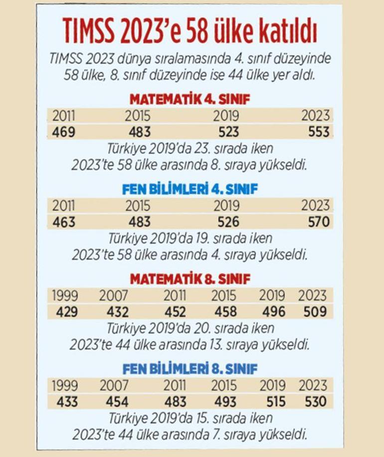 * TIMSS 2023’te 4’üncü sınıf fen bilimleri alanında puanını, 2019’a göre 44 artışla 570’e çıkaran Türkiye, OECDülkeleri arasında Güney Kore’den sonra 2’nci sırada yer aldı. 2019’da 15’inciydi. Bu performansıyla İngiltere, Japonya, Finlandiya, İsveç’igeride bıraktı. Tüm Avrupa ülkelerinin de üzerinde performans göstererek birinci sıraya yerleşti.