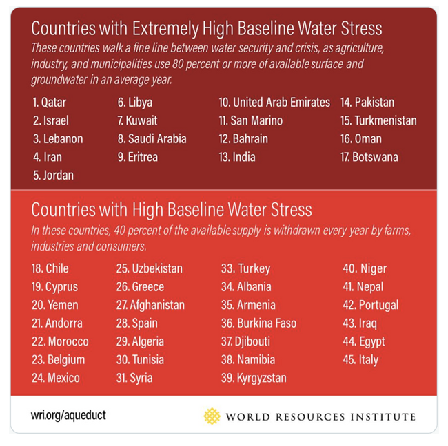 Ancak yukarıdaki grafikten sonra gelin bir de aşağıdaki WRI (World Resources Institute) verilerine bakalım. Aradaki bu yağış miktarı farkına rağmen Türkiye en çok su sıkıntısı çeken 33. ülke konumundayken benzer coğrafi koşullara sahip İtalya 45. Sırada yer almış. Şimdi gelin bunun sebeplerine inelim.