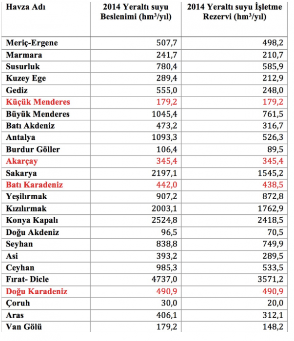 Öncelikle en çok su tüketimi gerçekleşen alana yönelmemiz gerekiyor sebeplerini incelememiz için. Verilere baktığımızda Türkiye’nin yıllık olarak su tüketiminin yüzde 75’ini sulama, tarım ve hayvancılık giderleri oluşturmaktadır. Büyükbaş hayvancılık, tarım gibi süreçler hem karbon salınımı yüksek hem de su tüketimi yüksek işlemlerdir. Ancak bunları da daha efektif harcamanın yolları da elbette ki mevcut. Örneğin üretimi sırasında en çok su tüketen ürünlerin başında mısır, pancar ve kavak gelir. Bu gibi ürünleri ekmek için en uygunsuz bölgelerden biri zaten içme suyu sağlamada bile sorun yaşayan İç Anadolu’dur. Bu durum gözetilerek İç Anadolu gibi kurak havzalarda “kuru tarım ürünleri” ekimi su planlamasında önemli role sahiptir. Aksi halde tarım işçileri mısır, pancar gibi çok su tüketen ürünlere yöneldiğinde yerüstü kaynaklarından su bulamadığı takdirde yeraltı su kaynaklarına yönelip kuyularla su çekmeye başlayacaktır. Bu da doğanın dengesini, göllerin ve akarsuların beslenmesini bozacaktır. Bu durumun en gözle görülür sonuçlarından biri de 2021 yazında çokça görüp duyduğumuz İç Anadolu’daki obruk oluşumudur. Normal şartlarda yerüstü kaynakları kritik seviyelere gelmedikçe yeraltı kaynaklarının kullanılması tavsiye edilmez ancak OECD ülkeleri arasında en fazla yeraltı kaynaklarına yönelen üçüncü ülke Türkiye olmuştur. Gün geçtikçe, göller kurudukça, yağışlar azaldıkça yeraltı su kaynaklarına talep artmaktadır. Türkiye’de son 60 yılda 70’e yakın gölün kuruduğunu düşünürsek, kullanılan yeraltı su kaynaklarının miktarının oldukça yüksek seviyelerde olduğunu tahmin edebiliriz. Aşağıdaki tabloda Türkiye’nin büyük havzalarının yeraltı suyu beslenimi ve işletme rezervlerini görebilirsiniz. İşletme rezervi beslenim miktarına ne kadar yakın olursa o kaynak sürdürülebilirliğe o kadar uzak demektir. Kırmızı ile işaretli havzalar ciddi derecede yok olma tehlikesi altında olan kaynaklarımız. Yeraltı sularının yenilenmesinin on yıllar aldığını düşünürsek bu kaynakların korunması Anadolu’nun iklimi ve üretkenliği için çok önemlidir.