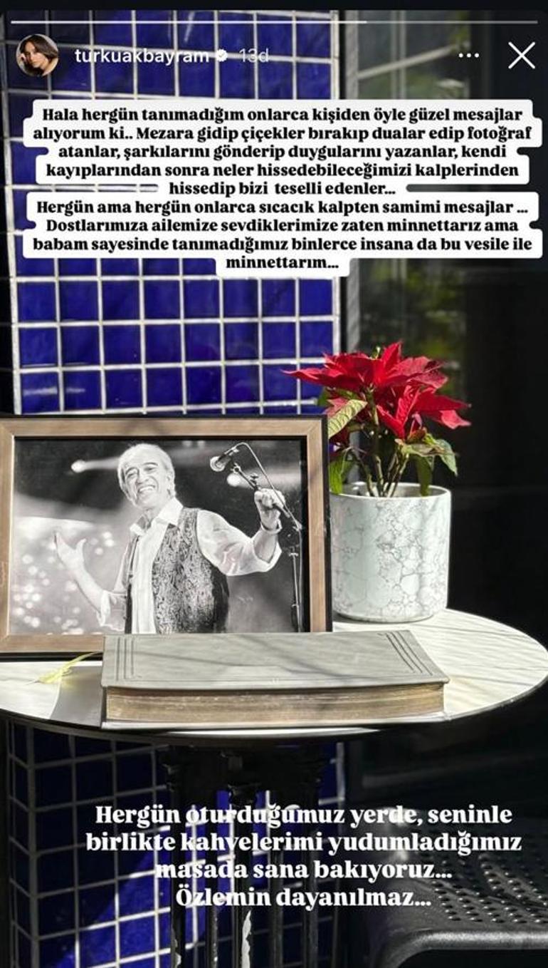 Babasının vefatının birinci ayında duygusal bir paylaşım yapan Türkü Akbayram, "Bir su damlası olup gökyüzünden okyanusa, sana karışacağım güne kadar “şimdilik” hoşçakal benim canım, biricik, çınarım dağım Babam" demişti.