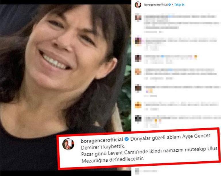Instagram hesabından ablasının fotoğrafını paylaşan Bora Gencer, "Dünyalar güzeli ablam Ayşe Gencer Demirer’i kaybettik. Pazar günü Levent Camii’inde ikindi namazını müteakip Ulus Mezarlığına defnedilecektir" ifadelerini kullandı.