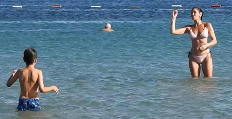 Kerem'in topu ıskalayarak yanlışlıkla başkalarının yakınlarına atmalarına anne-oğul ağızlarını kapatarak tepki verdi. Yaklaşık yarım saat kaldıkları denizde kalan ünlü oyuncunun eğlenceli anları objektiflere böyle yansıdı.