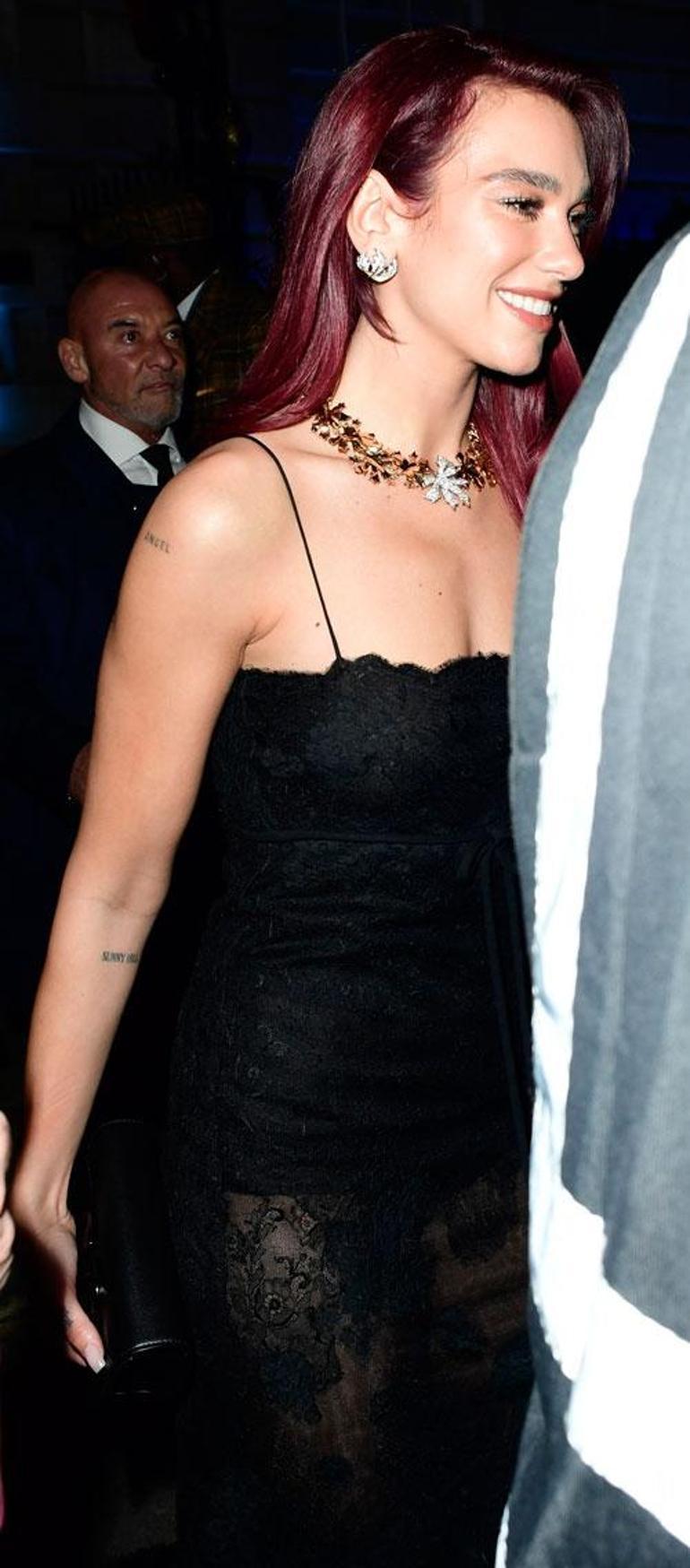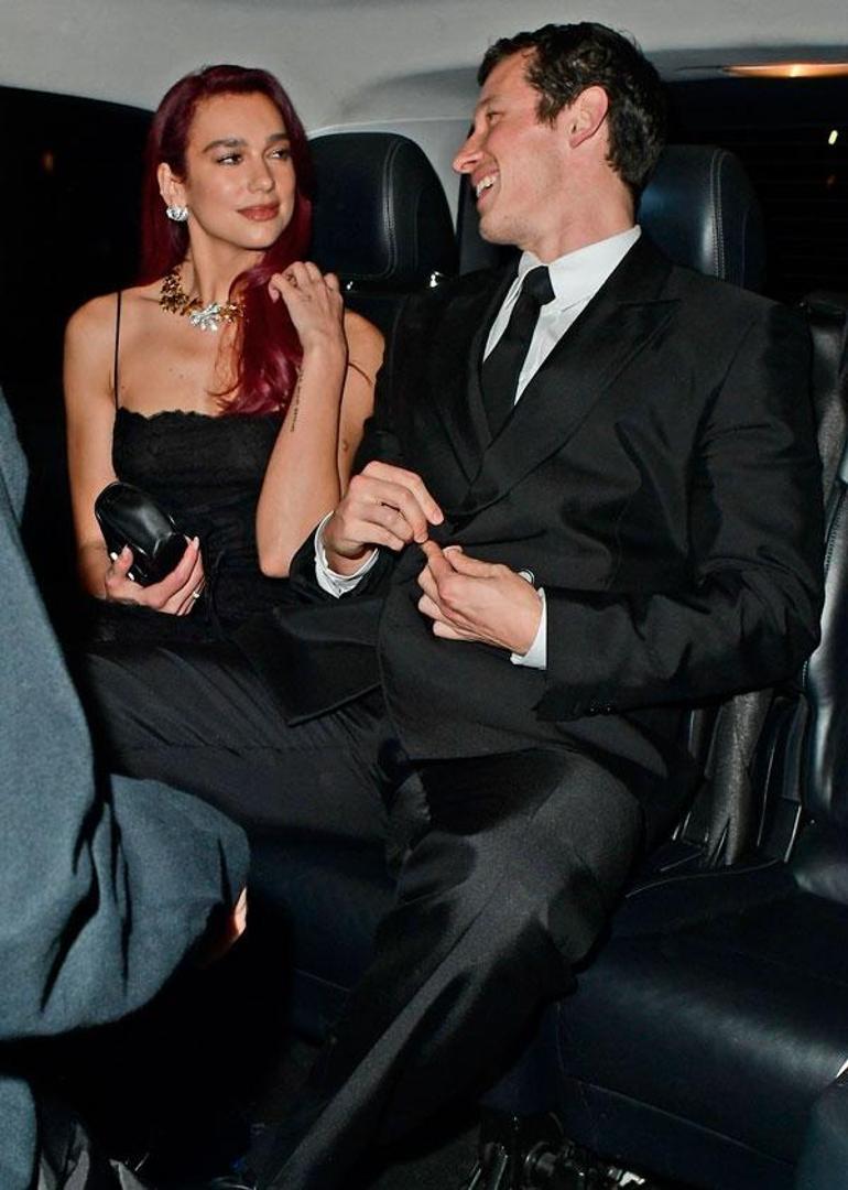 Lipa, tüylerle süslenmiş, vücuduna oturan siyah bir elbise tercih etti. Callum ise şık siyah takım elbisesi ve kravatıyla sevgilisini yanında boy gösterdi.