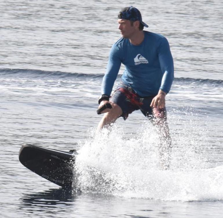Sabahın erken saatlerinde plaja gelen Tatlıtuğ, denizde adeta şov yaptı. Yaklaşık yarım saat süren jetsurf performansıyla göz dolduran oyuncu, sörf tahtasının üzerinde keyifli anlar yaşadı.