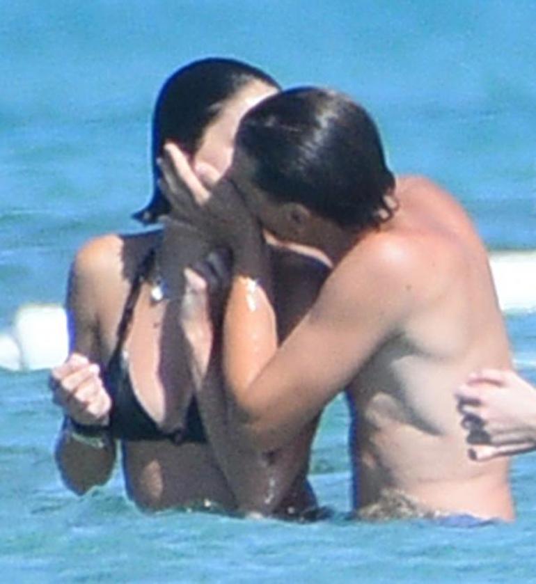 Çiftlikköy’de bir mekana giden ikili, önce suda şakalaşıp eğlenirken bir süre sonra çiçeği burnunda aşıklar gibi sarılıp öpüşmeye başladı.