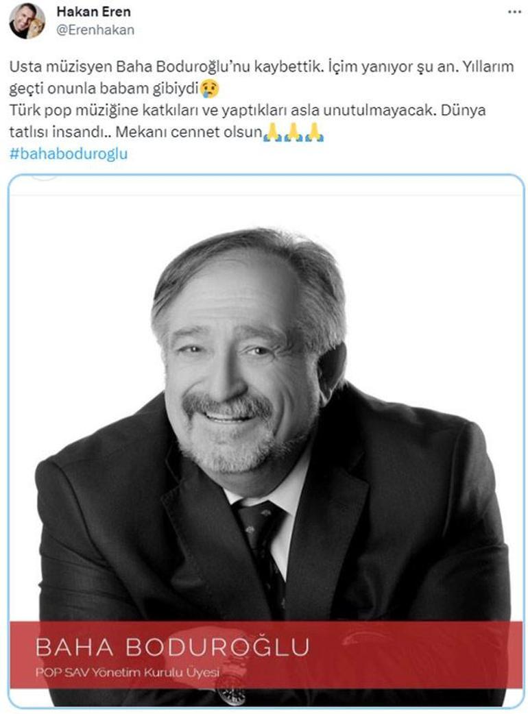 Yapımcı ve sunucu Hakan Eren, "Usta müzisyen Baha Boduroğlu’nu kaybettik. İçim yanıyor şu an. Yıllarım geçti onunla, babam gibiydi. Türk pop müziğine katkıları ve yaptıkları asla unutulmayacak. Dünya tatlısı insandı. Mekanı cennet olsun" ifadelerini kullandı.