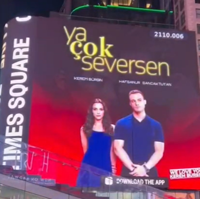 Başrolde Kerem Bürsin ve Hafsanur Sancaktutan’ı buluşturan 'Ya Çok Seversen' dizisinin tanıtımı, New York’un ünlü Times Meydanı’ndaki dev ekranda gösterildi.
