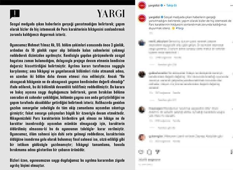Ay Yapım şirketi, Kanal D'de pazar akşamları yayınlanan, her bölümde heyecanın bir an olsun düşmediği Yargı dizisinde 'Savcı Pars' karakterine hayat veren Mehmet Yılmaz Ak'ın, sevilen diziden ayrıldığını duyurmuştu. Ak'ın yaşadığı sağlık sorunları gerekçesiyle diziye veda ettiği belirtilmişti.