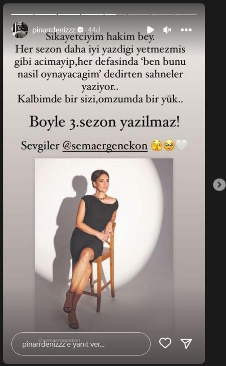 Başroldeki Pınar Deniz sosyal medyadan senarist Sema Ergenekon'a seslenerek “Şikayetçiyim hâkim bey. Her sezon daha iyi yazdığı yetmezmiş gibi acımayıp her defasında 'Ben bunu nasıl oynayacağım' dedirten sahneler yazıyor. Kalbimde bir sızı, omzumda bir yük. Böyle üçüncü sezon yazılmaz" dedi.