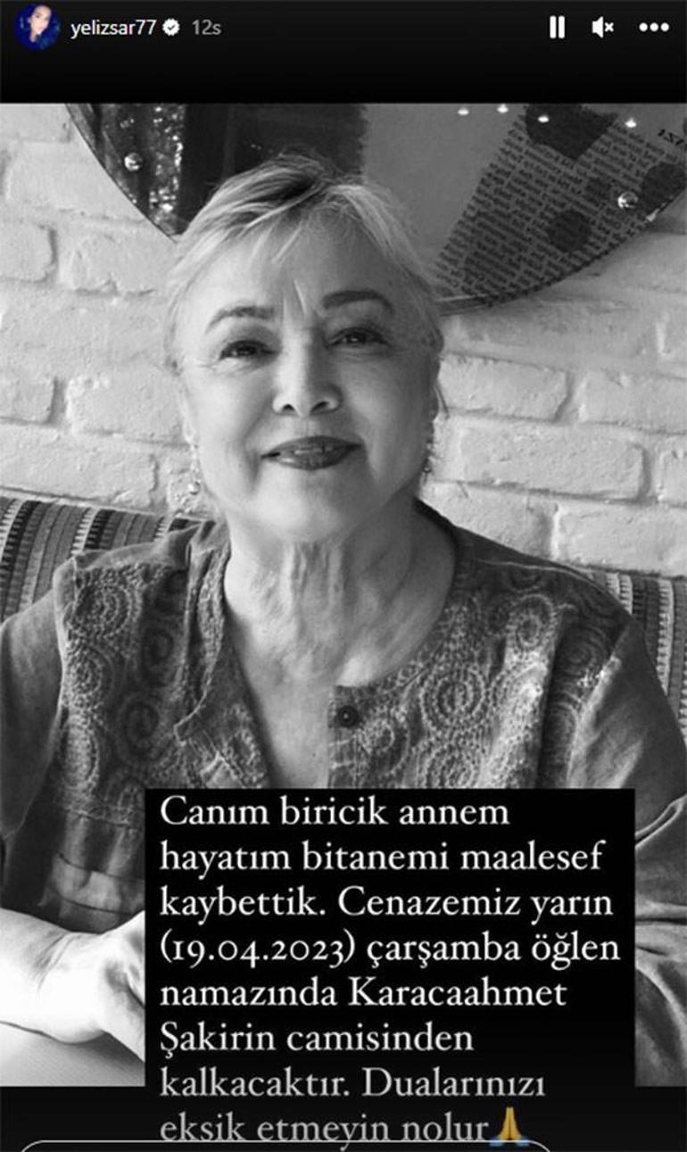 'Sensiz Olmuyor', 'Yaprak Dökümü', 'İşler Güçler' ve 'Yasak Elma' gibi birçok projede rol alan Yeliz Şar'ın annesi Şehriban Şule Şar yaşamını yitirdi. Ünlü oyuncu, vefat haberini Instagram hesabından duyurdu.