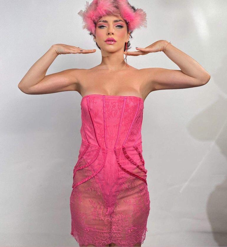 Pembe renkteki kıyafetlerini giyerek çeşitli pozlar veren oyuncu dekolteli seçimleriyle dikkat çekti. Merve Boluğur bir paylaşımında pencere detaylı elbise giydi ancak belden aşağısını da eliyle kapatarak frikikleri önlemek istedi.