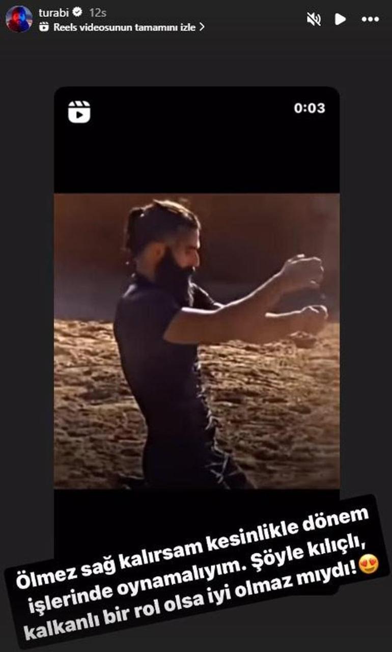 Survivor'da kazandığı bir oyun sonrası yaptığı sevinç gösterisini de paylaşan Turabi, "Ölmez sağ kalırsam kesinlikle dönem işlerinde oynamalıyım. Şöyle kılıçlı, kalkanlı bir rol olsa iyi olmaz mıydı?" mesajıyla yapımcılara seslenmeyi de ihmal etmemişti.