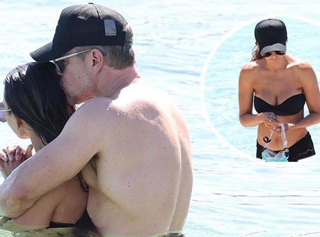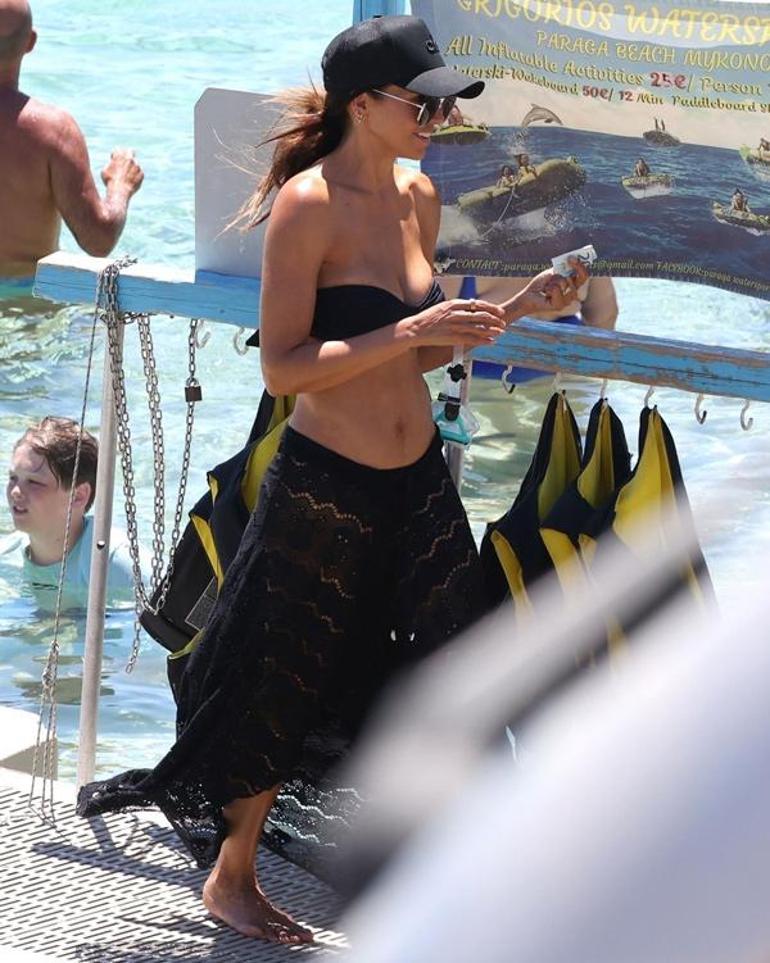 Siyah bir bikini giymeyi tercih eden eşine siyah mayosuyla uyum sağlayan aktör, beyzbol şapkası ve gözlük takarak kendini güneşten korudu.