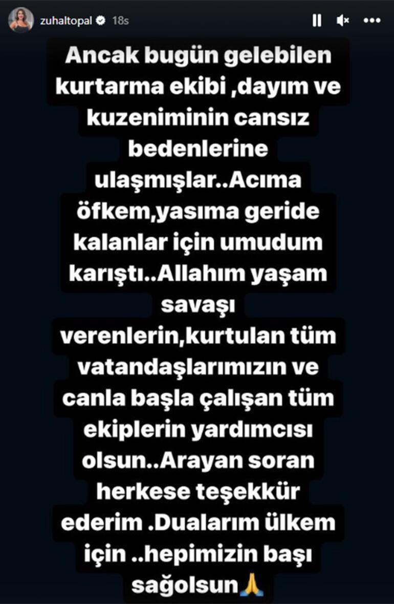 Instagram hesabından dayısı, kuzeni ve arkadaşını kaybettiğini duyuran ünlü sunucu, "Kurtarma ekibi dayım ve kuzenimin cansız bedenlerine ulaştılar. Acıma öfkem, yasıma geride kalanlar için umudum karıştı. Allah'ım yaşam savaşı verenlerini kurtulan tüm vatandaşlarımızın ve canla başla çalışan tüm ekiplerin yardımcısı olsun. Arayan soran herkese teşekkür ederim. Dualarım ülkem için. Hepimizin başı sağ olsun" ifadelerini kullanmıştı.